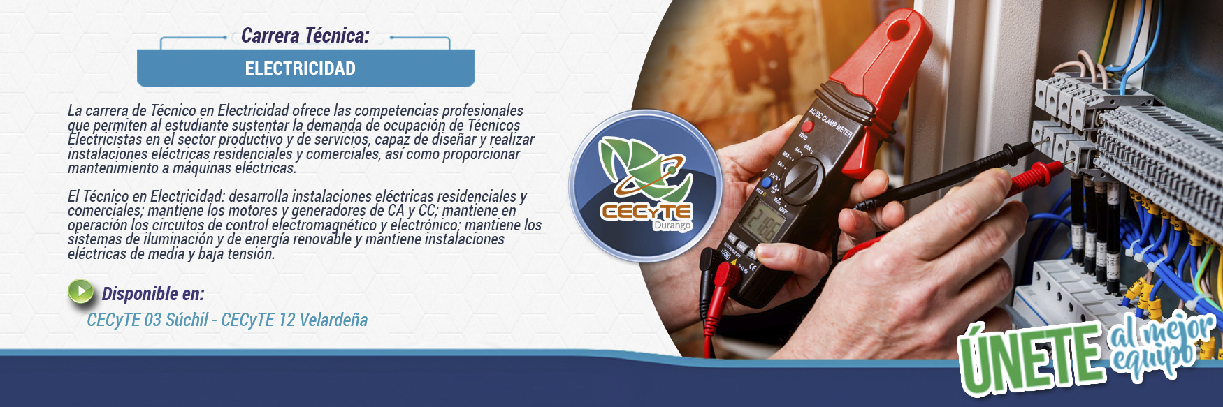 La formación que ofrece la carrera de Técnico en Electricidad permite al egresado, a través de la articulación de saberes de diversos campos, realizar actividades dirigidas a la certificación como técnico eléctrico.