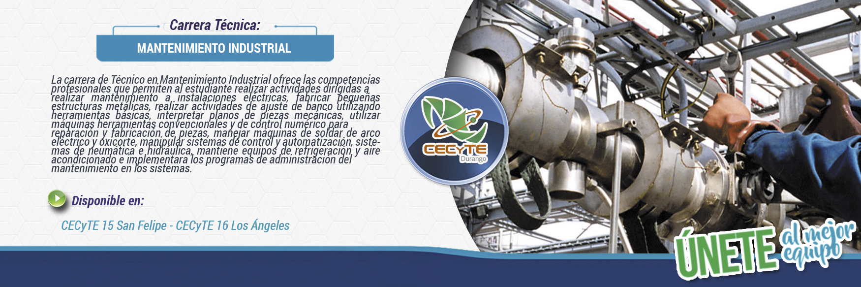 La carrera de Técnico en mantenimiento industrial ofrece las competencias profesionales que permiten al estudiante realizar actividades dirigidas a realizar mantenimiento a instalaciones eléctricas, fabricar pequeñas estructuras metálicas, realiza actividades de ajuste de banco utilizando herramientas básicas, interpretar planos de piezas mecánicas, utilizar máquinas herramientas convencionales y de control numérico para reparación y fabricación de piezas, manejar máquinas de soldar de arco eléctrico y oxicorte, manipular sistemas de control y automatización, sistemas de neumática e hidráulica, mantiene equipos de refrigeración y aire acondicionado e implementara los programas de administración del mantenimiento en los sistemas.