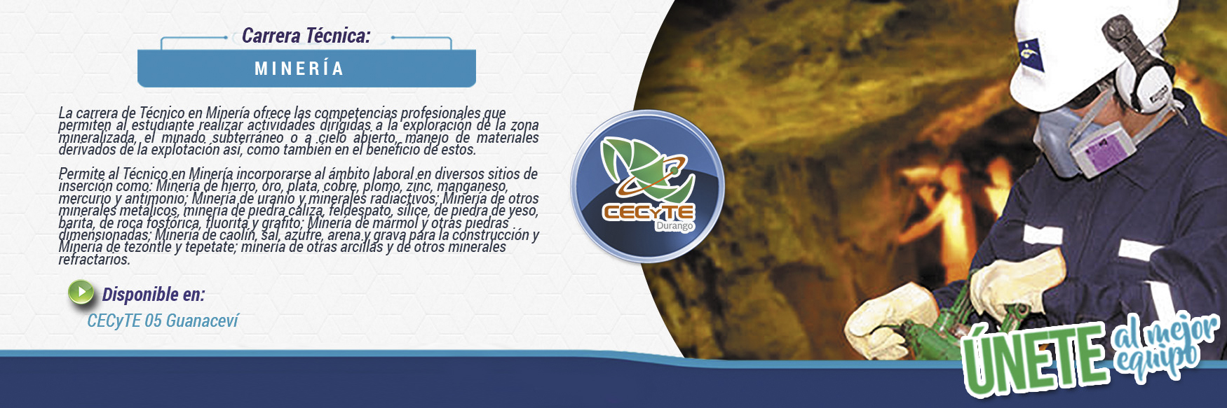 La carrera de Técnico en minería ofrece las competencias profesionales que permiten al estudiante realizar actividades dirigidas a la exploración de la zona mineralizada, el minado subterráneo o a cielo abierto, manejo de materiales derivados de la explotación así, como también en el beneficio de estos.