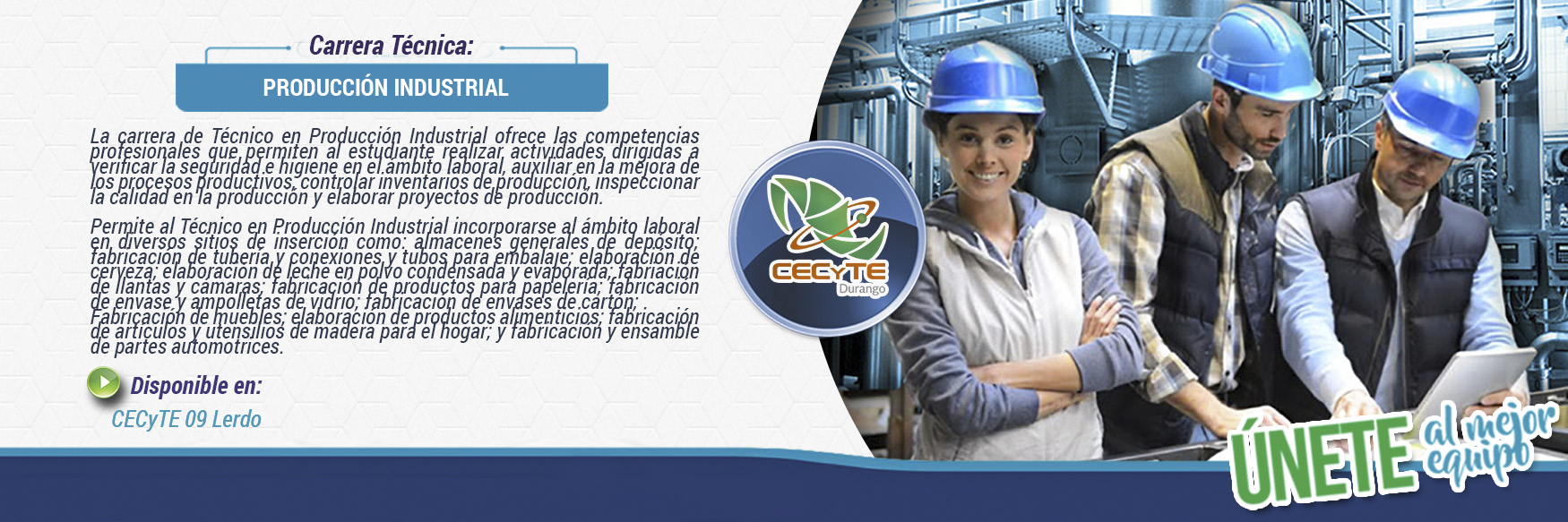La carrera de Técnico en producción industrial ofrece las competencias profesionales que permiten al estudiante realizar actividades dirigidas a verificar la seguridad e higiene en el ámbito laboral, auxiliar en la mejora de los procesos productivos, controlar inventarios de producción, Inspeccionar la calidad en la producción y elaborar proyectos de producción.