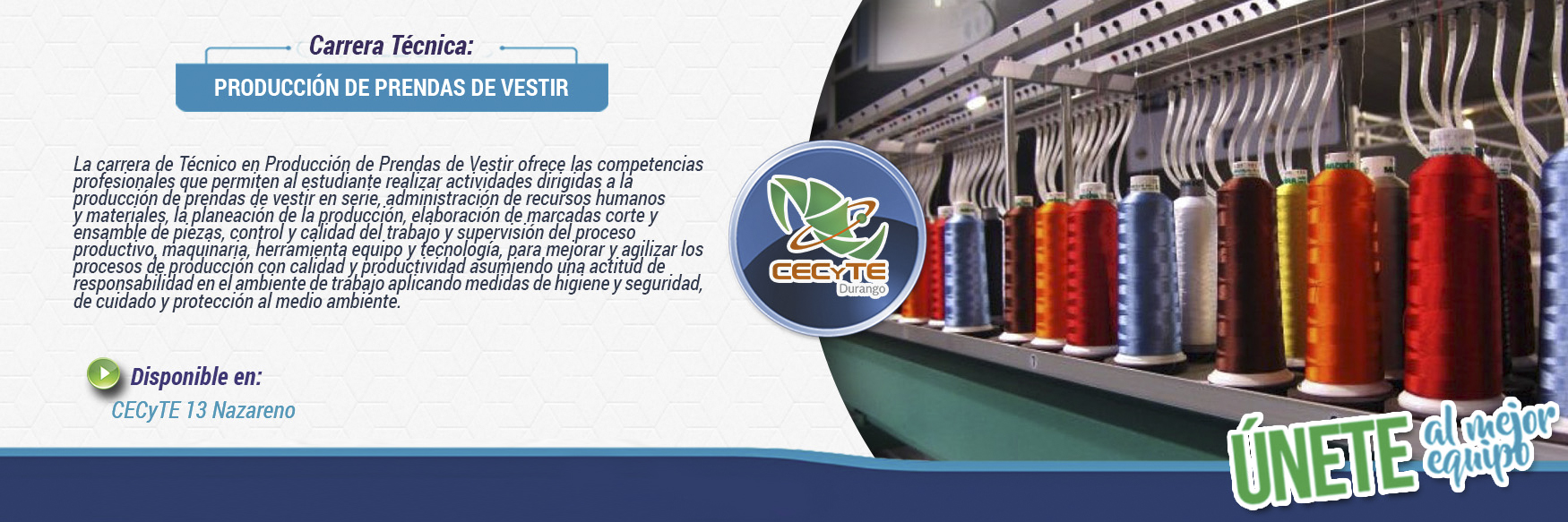 La carrera de Técnico en Producción de Prendas de Vestir ofrece las competencias profesionales que permiten al estudiante realizar actividades dirigidas a la producción de prendas de vestir en serie, administración de recursos humanos y materiales, la planeación de la producción, elaboración de marcadas corte y ensamble de piezas, control y calidad del trabajo y supervisión del proceso productivo, maquinaria, herramienta equipo y tecnología, para mejorar y agilizar los procesos de producción con calidad y productividad asumiendo una actitud de responsabilidad en el ambiente de trabajo aplicando medidas de higiene y seguridad, de cuidado y protección al medio ambiente.
